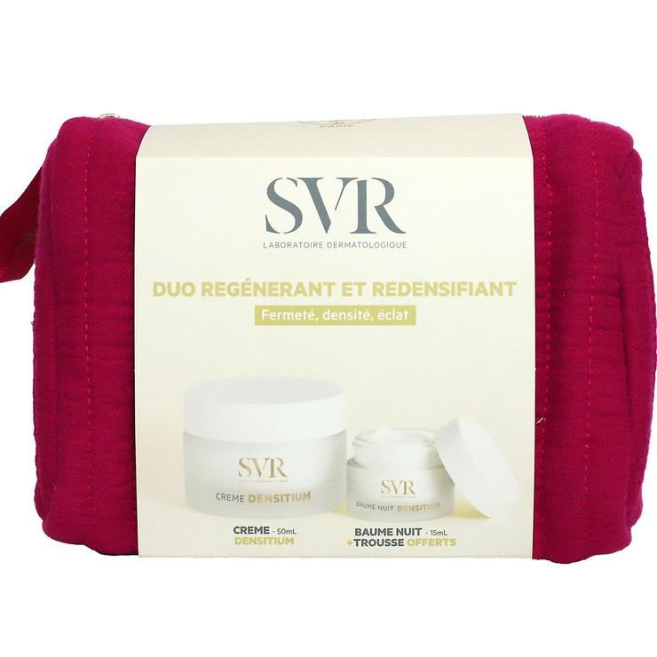 La trousse est composée de SVR Densitium Crème Correction Globale 50 ml et de SVR Densitium Baume Nuit 15 ml.