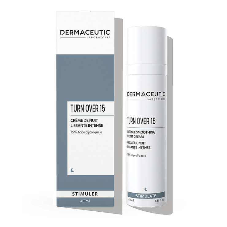 Turn Over 15 de Dermaceutic est un soin exfoliant à 15 % d’acide glycolique qui stimule le renouvellement cellulaire, réduit visiblement rides et ridules, lisse la peau et redonne de l’éclat au teint, convenant à tous les types de peau et fabriqué en France.