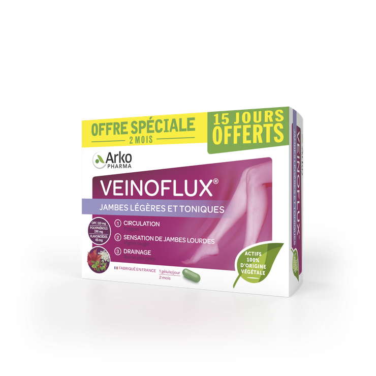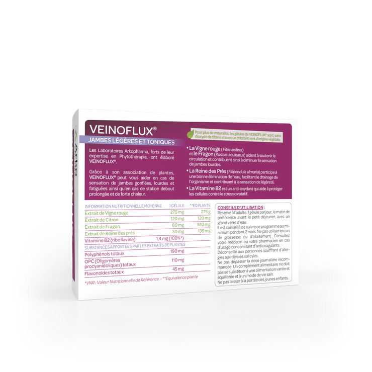 Les gélules Veinoflux jambes légères et toniques Arkopharma constituent un complément alimentaire recommandé en cas de sensations de jambes lourdes notamment chez les femmes. Elles sont formulées à base de fragon qui favorise la circulation sanguine, de reine des prés qui a une action drainante et de vigne rouge qui agit sur les jambes lourdes. Ces gélules sont fortement conseillées en période de grosse chaleur ou en cas de station debout prolongée.