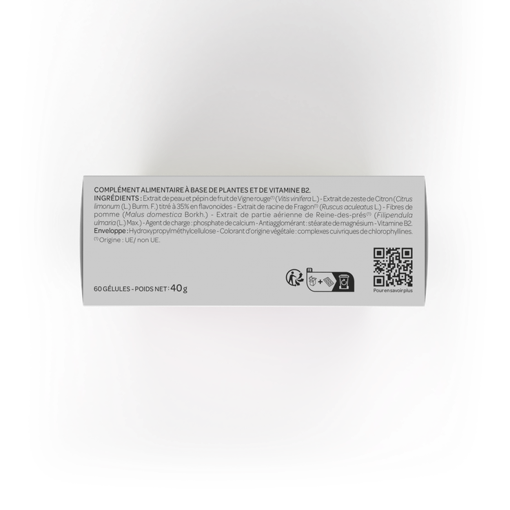 Extrait de peau et pépin de fruit de vigne rouge (Vitis vinifera L.), Extrait de zeste de citron (Citrus limonum (L.) Burm. F.) titré à 35% en flavonoïdes, Extrait de racine de fragon (Ruscus aculeatus L.), Fibres de pomme (Malus domestica Borkh.), Extrait de partie aérienne de reine des prés (Filipendula ulmaria (L.) Max.), Agent de charge : Phosphate de calcium, Antiagglomérant : Stéarate de magnésium, Vitamine B2. Enveloppe : Hydroxypropylméthycellulose, Colorant d'origine végétale : Complexes cuivriques de chlorophyllines.