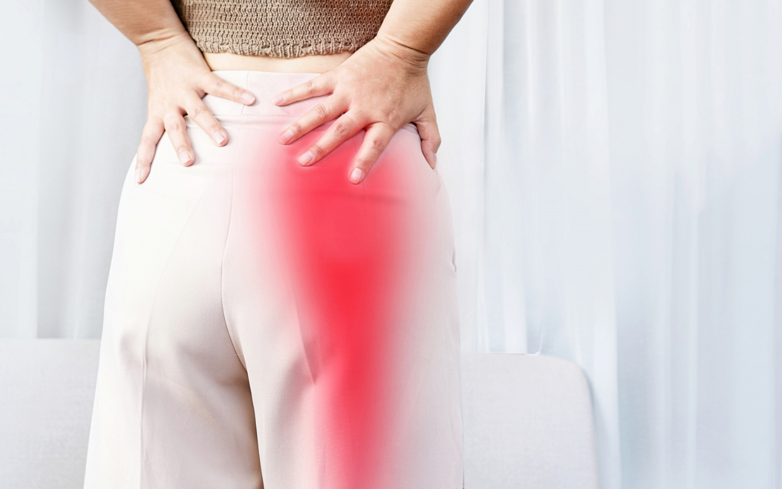 La névralgie sciatique ou « sciatique » est une douleur ressentie d’un seul côté du corps, le long du nerf sciatique, c’est-à-dire au niveau de la fesse et de la jambe, et parfois dans le bas du dos. Dans 95 % des cas, cette douleur vive est causée par une hernie discale, c’est-à-dire une protusion (débordement) d’un disque intervertébral qui comprime alors une des racines du nerf sciatique.