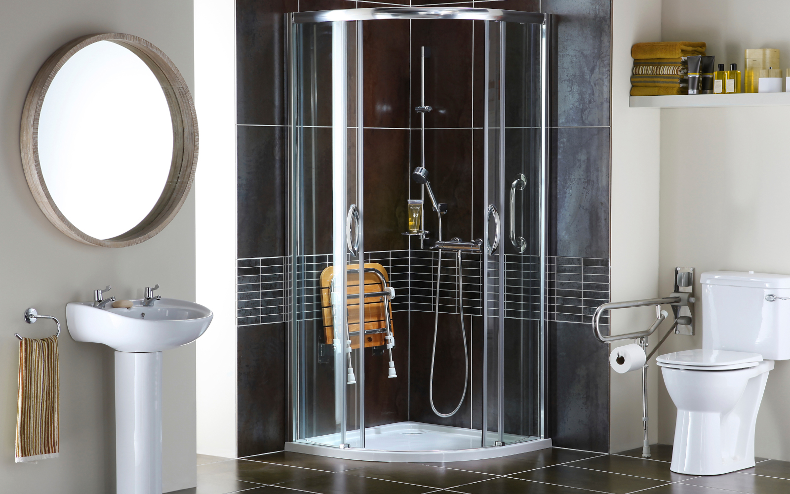 Si votre mobilité est plus restreinte, un siège de douche pivotant avec un dossier et des accoudoirs améliorera votre confort et votre stabilité.